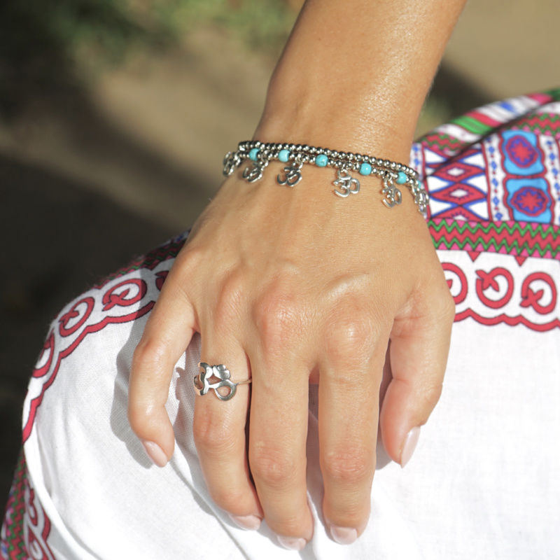 Voor alle mensen die houden van yoga en meditatie!brass kraaljtes, turquoise kraaltjes, ohm bedeltjes, bruin waxdraad, maat: 25 en 17 cm (2 belletjes als 2 sluitingen), Let op, dit armbandje is niet zo groot, het is verstandig je polsomtrek op te meten om te kijken of het bandje past.