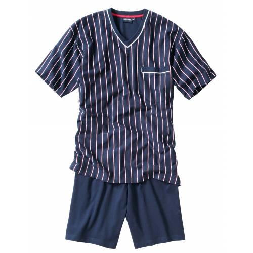 \\n 100% katoen, hele mooie en goede kwaliteit heren shortama, in de grotere heren maten.\\n\\n \\n donkerblauw shirt met V-hals en wit/rood streep motief\\n \\n uni donkerblauwe korte broek\\n\\n\\n \\n