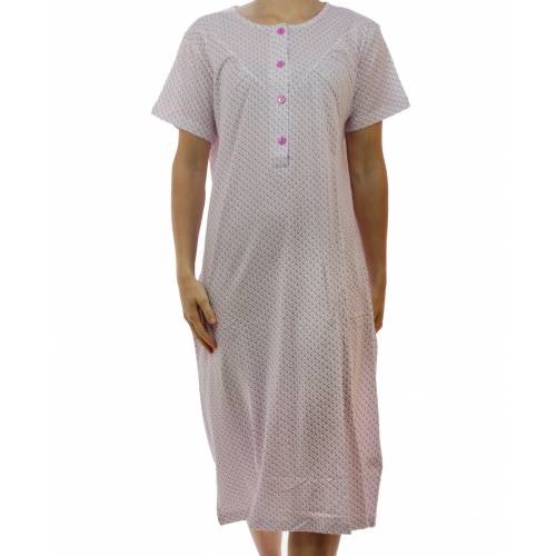 \\n 100% katoen, klassiek tricot nachthemd met korte mouw en ronde hals met korte knoopsluiting met 4 knoopjesmet allover kleine ovaal en stippel dessinlengte nachthemd 110 cm \\n \\n breedte maat M =56 cm \\n breedte maat L = 59 cm \\n\\n\\n