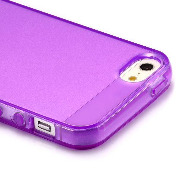 Paars transparante iPhone 5 TPU Case, voorzien van de benodigde uitsparingen voor knoppen camera en toegangspoorten. Geeft uw iPhone 5 een goede bescherming tegen beschadigingen en maakt deze amper dikker. Lees meer
