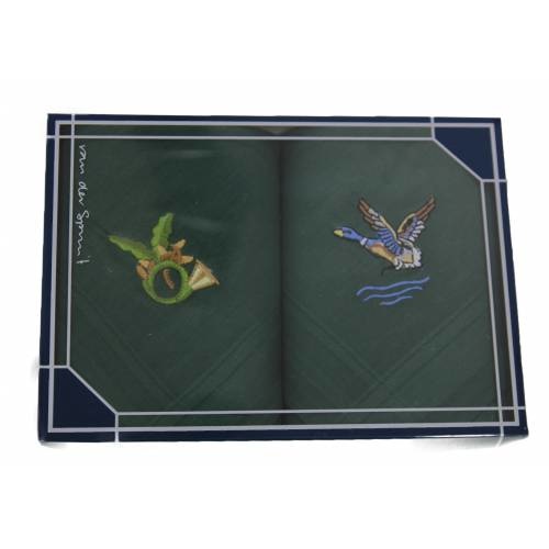 \\n 100% katoenen Jager heren zakdoek, super mooie kwaliteit!\\n\\n \\n zakdoek in groene ondergrond met Jagers print\\n \\n Goede kwalieit zakdoeken die met smal zoompje rondom is afgewerkt\\n \\n met jachthoor, hert, gans of vogel print in borduursel\\n\\n\\n \\n
