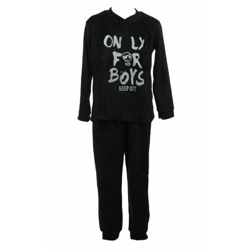 \\n 80% katoen 20% polyester, hele mooie kwaliteit velourse jongenspyjama\\n\\n \\n Met 'Only For Boys, keep out' tekstprint\\n \\n de pyjama heeft een kleine V-hals \\n \\n met boordjes aan de mouwen en aan de broek.\\n\\n