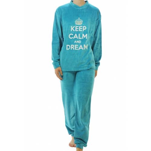 \\n 80% katoen 20% polyester, super mooie kwaliteit velourse pyjama\\n\\n \\n met leuke 'Keep Calm and Dream' tekstprint\\n \\n de pyjama heeft een ronde hals \\n \\n met boordjes aan de mouwen en aan de broek.\\n \\n maat 188 is een lengtemaat die dezelfde lengte heeft als maat M, de pyjama is alleen smaller\\n\\n