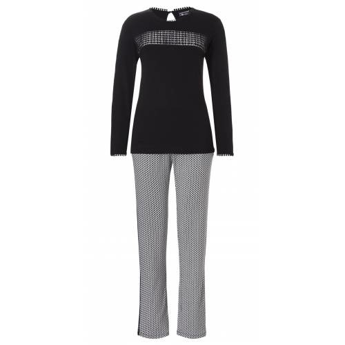 \\n 95% bamboe 5% Elasthan, kwalitatief hele mooie bamboe dames pyjama met lange mouwen en lange broek.\\n\\n uni zwart shirt met een chique kantje over de borst heen en mooi randje langs de ronde hals en mouwenuit de Pastunette Deluxe serie\\n zwart/witte broek met rechte pijpen, steekzakken en stoffen bandFijne bamboe kwaliteit die heerlijk zacht en soepel aanvoeltBamboe is duurzaam & milieuvriendelijk\\n\\n\\n \\n