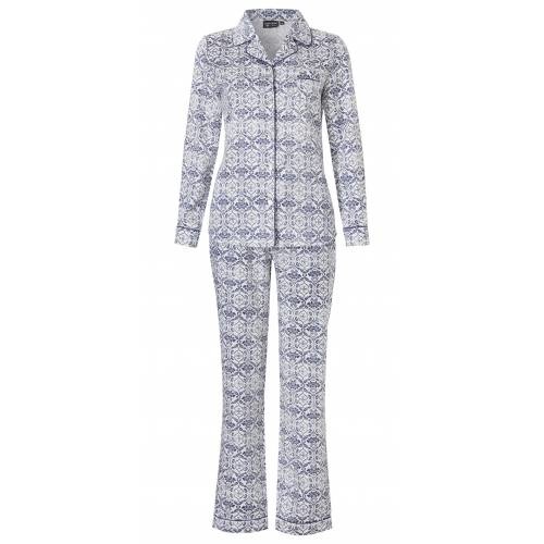 83% Polyester 17% katoen hele mooie kwaliteit satijnen doorknoop pyjama in de Pastunette Deluxe serie\\n\\n creme-kleurige ondergrond met een chique donkerblauwe flower printjasje is een beetje getailleerd.\\n shirt heeft een doorknoop sluiting en een kraagjede pyjama is aan de binnenzijde licht katoen geruwdbroek heeft stoffen band met koord en rechte pijpenafmetingen:maat 38: borstomvang 96 cm / lengte 66 cm, broekband omtrek 80 - 94 cm maat 42: borstomvang 106 cm / lengte 70 cm, broekband omtrek 80 - 98 cmmaat 46: borstomvang 116 cm / lengte 72 cm, broekband omtrek 90 -108 cm doordat de stof niet meerekt moet u de maat niet te krap nemen \\n\\n\\n \\n\\n \\n