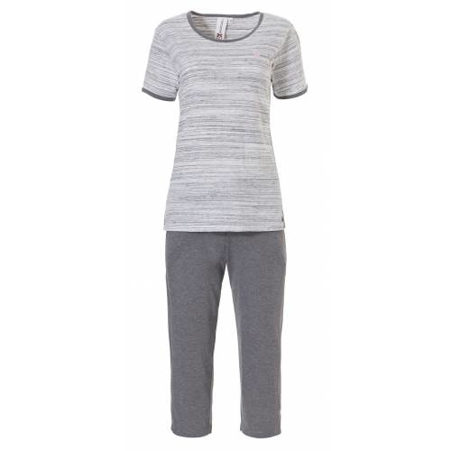 Top 90% katoen/ 10% Polyester Broek: 50% katoen/ 50% Polyester, hele leuke dames tricot shortama met 3/4 broekHet grijs gemelleerde shirt met korte mouwen heeft kleine hartjes applicatieAfgewerkt met donkergrijze randjes langs de hals en boordjesuni antracite 3/4 broek met 2 steekzakken en en stoffen band met koord \\n