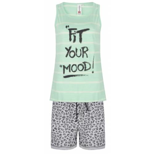 \\n Top 82% katoen 18% Viscose Broek: 93% katoen 7% Polyester, hele leuke meiden / dames shortama met kort broekje\\n\\n \\n mouwloos gemelleerd shirt en 'Fit Your Mood' tekstprint\\n \\n grijs kort broek met luipaard print\\n \\n broekje heeft een stoffen band met koord en sierknoopsluiting\\n\\n
