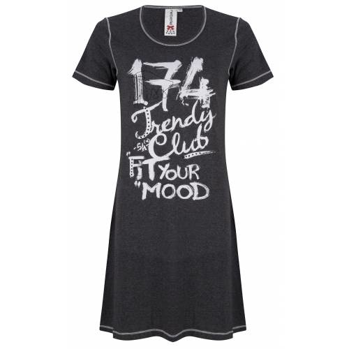 \\n 40% katoen/ 60% Polyester, mooi en leuk tricot nachthemd met korte mouwen\\n\\n \\n antracite kleurig shirt heeft een tekstprint 'Trendy Club Fit Your Mood\\n \\n met een wit gestikt randje langs de mouwen, hals en onderkant shirt\\n \\n lengte nachthemd maat 90 cm \\n \\n licht getailleerd model\\n\\n\\n \\n