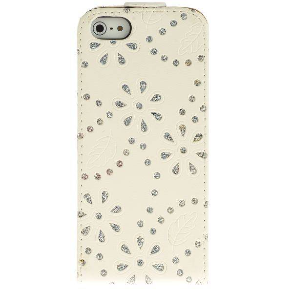Fraaie witte rhinestone flipcase, speciaal ontwikkeld voor de iPhone 5. Vervaardigd uit stevig leder met een ingebouwde case voor een volledige bescherming van de iPhone. Lees meer