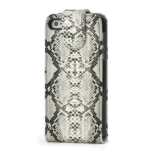 Geef je iPhone 5/5S een luxueuze uitstraling met deze fraaie slangen lederen Flip Case. De case is voorzien van een sterke magneetsluiting en uitsparingen voor camera,knoppen en toegangspoorten.Ook is de Flip case uitgerust met 2 handige vakjes voor pasjes, geld of een pasfoto
