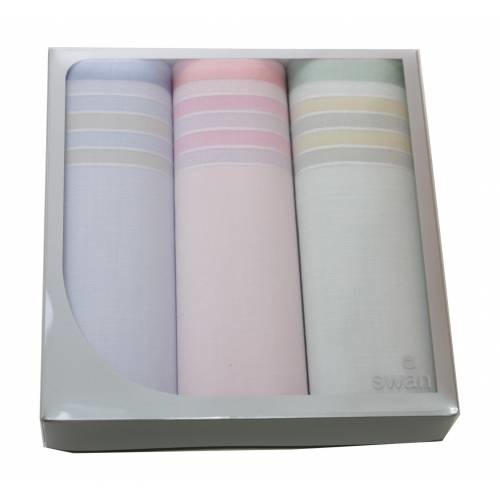 \\n 100% katoen, mooie kwaliteit katoen met satijnen dames zakdoeken van het merk Swan\\n\\n \\n met de kleuren blauw,rose en groen per doosje\\n \\n per 3 stuks in een mooi luxe doosje verpakt\\n \\n zakdoek is romdom afgewerkt met een smal zoompje\\n \\n afmeting zakdoek 30 x 30 cm\\n\\n